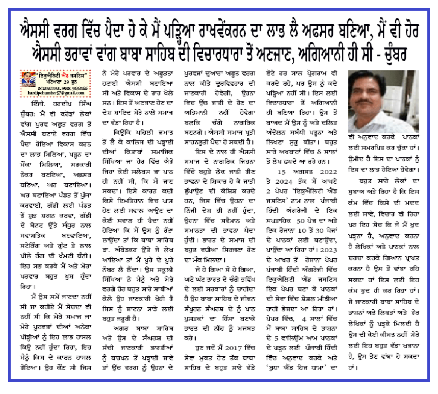 15 ਅਗਸਤ 2022 ਤੋ 2024 ਤੱਕ ਮੈਂ ਆਪਣੇ 2 ਪੇਪਰ ‘ਇਕੁਐਲਿਟੀ ਐਂਡ ਜਸਟਿਸ’ ਨਾਮ ਨਾਲ ਪੰਜਾਬੀ ਹਿੰਦੀ ਅੰਗਰੇਜੀ ਦੇ ਇਕ ਸਪਤਾਹਿਕ 50 ਪੇਜ ਦਾ ਅਤੇ ਇਕ ਰੋਜਾਨਾ 10 ਤੋਂ 30 ਪੇਜਾਂ ਦੇ ਪਾਠਕਾਂ ਲਈ ਬਣਾਉਂਦਾ, ਪਾਉਂਦਾ ਆ ਰਿਹਾ ਹਾਂ। 2023 ਦੇ ਆਖਰ ਤੋਂ ਰੋਜਾਨਾ ਪੇਪਰ ਪੰਜਾਬੀ ਹਿੰਦੀ ਅੰਗਰੇਜੀ ਵਿੱਚ ਇਕੁਐਲਿਟੀ ਐਂਡ ਜਸਟਿਸ ਇਕ ਪੇਪਰ ਬਣਾ ਕੇ ਪਾਠਕਾਂ ਦੀ ਸੇਵਾ ਵਿੱਚ ਸ਼ੋਸ਼ਲ ਮੀਡੀਆ ਰਾਹੀ ਭੇਜਦਾ ਆ ਰਿਹਾ ਹਾਂ। ਪੇਪਰ ਵਿੱਚ, 4 ਸਾਲਾਂ ਵਿੱਚ ਮੈਂ ਬਾਬਾ ਸਾਹਿਬ ਦੇ ਭਾਸ਼ਨਾ ਦੇ 5 ਵਾਲਿਉਂਮ ਆਮ ਪਾਠਕਾਂ ਦੇ ਪੜ੍ਹਨ ਲਈ ਪੰਜਾਬੀ ਹਿੰਦੀ ਵਿੱਚ ਅਨੁਵਾਦ ਕਰਕੇ ਅਤੇ ‘ਬੁਧਾ ਐਂਡ ਹਿਜ ਧਾਮਾ’ ਦਾ ਵੀ ਅਨੁਵਾਦ ਕਰਕੇ ਪਾਠਕਾਂ ਲਈ ਸਮਰਪਿਤ ਕਰ ਚੁੱੱਕਾ ਹਾਂ। ਉਮੀਦ ਹੈ ਇਸ ਦਾ ਪਾਠਕਾਂ ਨੂੰ ਇਸ ਦਾ ਲਾਭ ਹੋਇਆ ਹੋਵੇਗਾ।