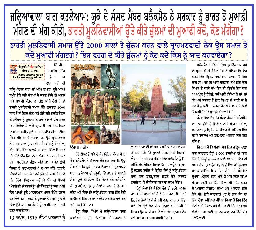 ਜਲ੍ਹਿਆਂਵਾਲਾ ਬਾਗ ਕਤਲੇਆਮ: ਯੂਕੇ ਦੇ ਸੰਸਦ ਮੈਂਬਰ ਬਲੈਕਮੈਨ ਨੇ ਸਰਕਾਰ ਨੂੰ ਭਾਰਤ ਤੋਂ ਮੁਆਫ਼ੀ ਮੰਗਣ ਦੀ ਮੰਗ ਕੀਤੀ, ਭਾਰਤੀ ਮੂਲਨਿਵਾਸੀਆਂ ਉੱਤੇ ਕੀਤੇ ਜ਼ੁੱਲਮਾਂ ਦੀ ਮੁਆਫੀ ਕਦੋਂ, ਕੋਣ ਮੰਗੇਗਾ?